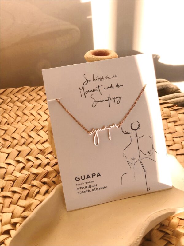 HOLÁ GUAPA - das perfekte Geschenk, um deiner Freundin ein Lächeln ins Gesicht zu zaubern. Guapa sprich 'gwapa' ist spanisch und bedeutet hübsch - so hübsch wie der Moment kurz nach dem Sonnenuntergang... Handgefertigt aus recyceltem Edelstahl, mit zartem Roségold überzogen. Verstellbare Länge: bis zu 18 cm, Charm: 2 cm. WASSERBESTÄNDIG.